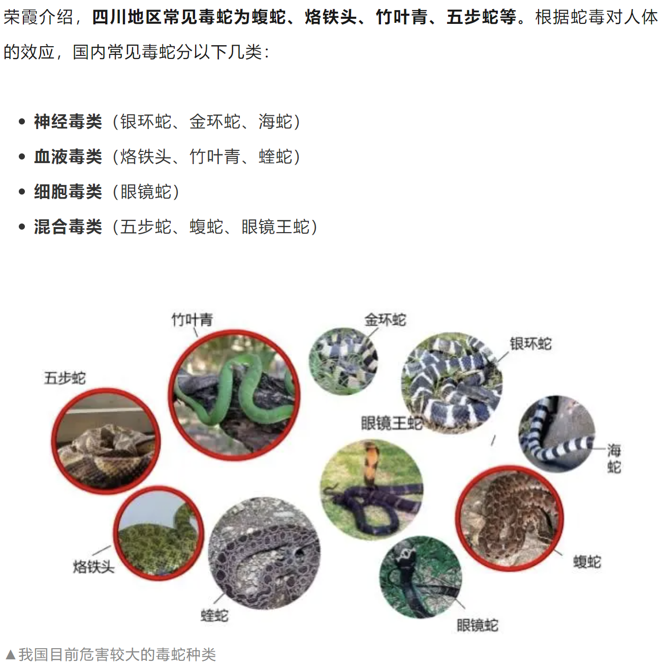 荣霞告诉记者,普通的蛇咬伤一般伤口细小,伴轻微刺痛,可有小水泡,使用70%酒精消毒后尽快就医。同时,蛇咬伤后尽量减少主动活动,防止毒素快速扩散,要避免饮用含酒精的饮品。不建议为了识别蛇去抓蛇、杀蛇或拍照。