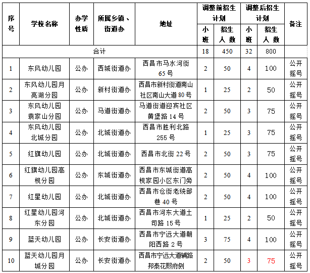 为深入贯彻落实国家学前教育普及普惠发展,进一步优化教育资源配置,切实满足人民群众对优质学前教育的需求,结合西昌市学前教育发展现状及城区公办幼儿园学位供给情况,经研究决定,对2025年秋季学期城区公办幼儿园摇号招生计划进行调整,共新增小班摇号招生计划350人,新增班级14个,按程序于2025年7月8日在“四川省教育公共信息服务平台升招业务系统”一次性摇出。