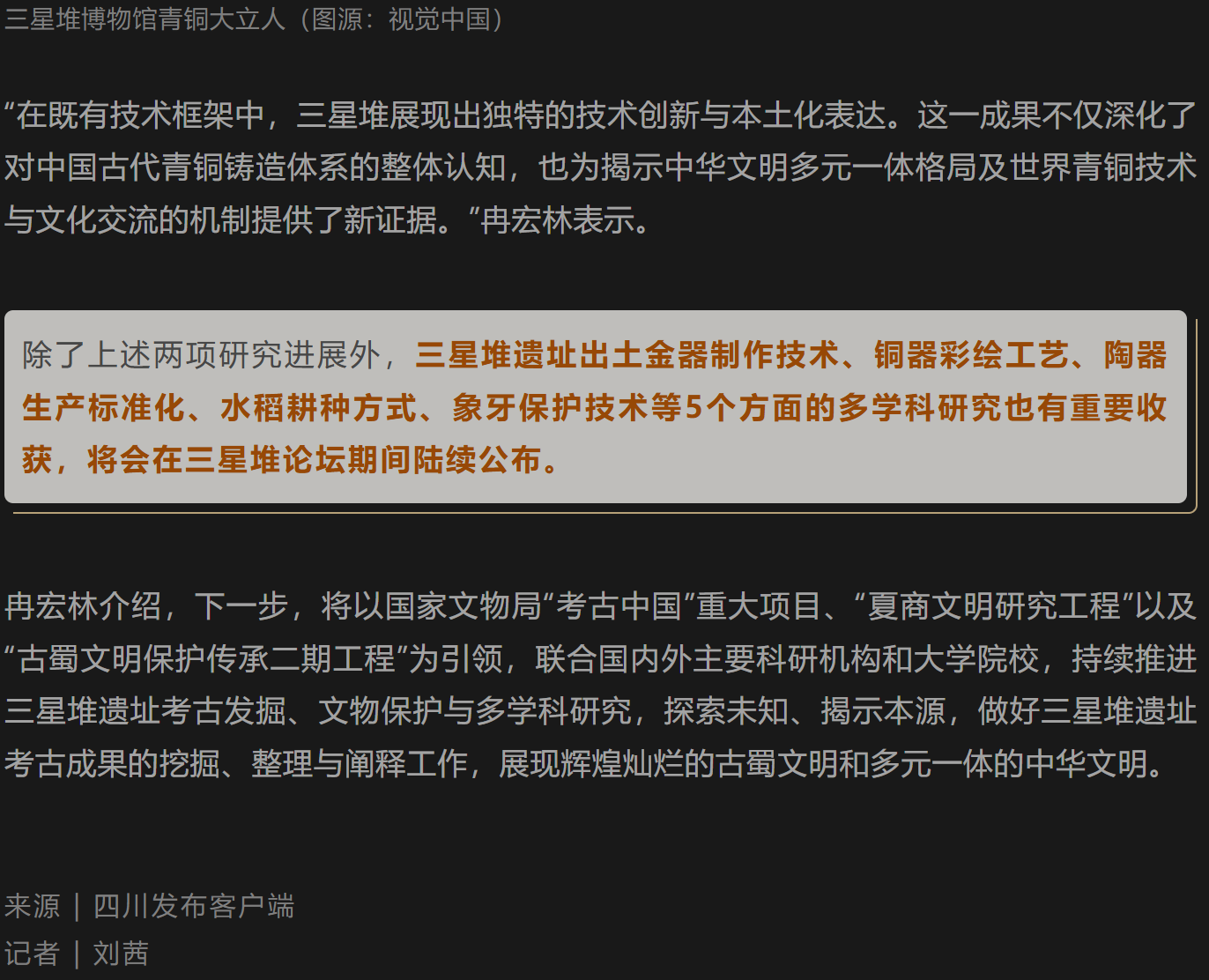 同时,冉宏林发布三星堆青铜器创新铸造技术。经四川省文物考古研究院、故宫博物院、北京科技大学与英国剑桥李约瑟研究所的联合研究,对青铜器铸造工艺有了新的认识。研究显示,三星堆青铜器在商代晚期形成以分铸为核心,兼用浑铸、锻造的创新铸造技术体系。独特的“芯骨—条形芯撑”技术,有效解决了细长、弯曲器物的成型难题。