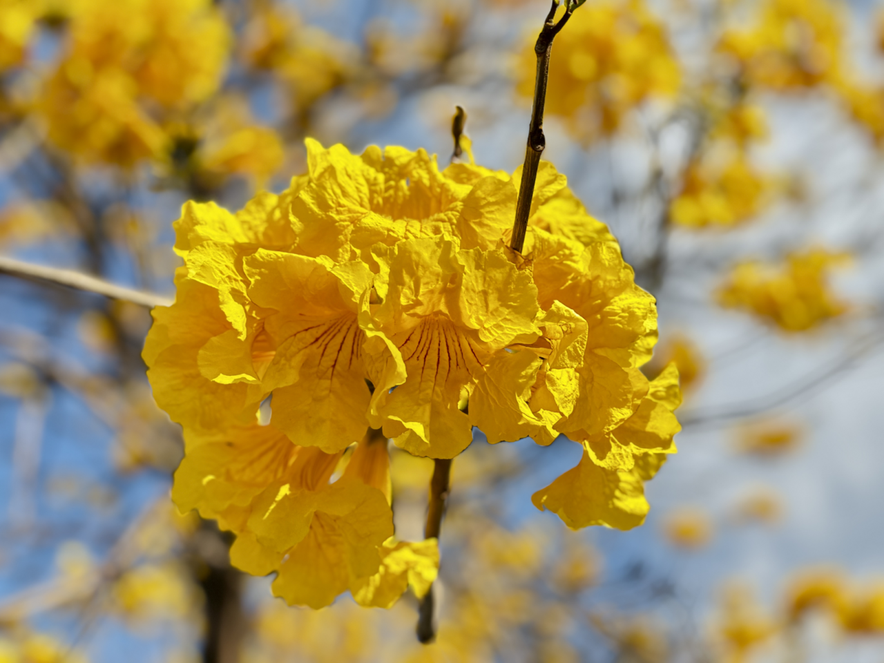 抬眼望去,那片黄花风铃木宛如一片金色云霞,铺展在湛蓝的天空下。每一朵花都像是精心雕琢的艺术品,花瓣边缘微微卷曲,透着一种灵动的美,在阳光下闪烁着金色的光芒,把整个世界都装点得明媚而温暖。