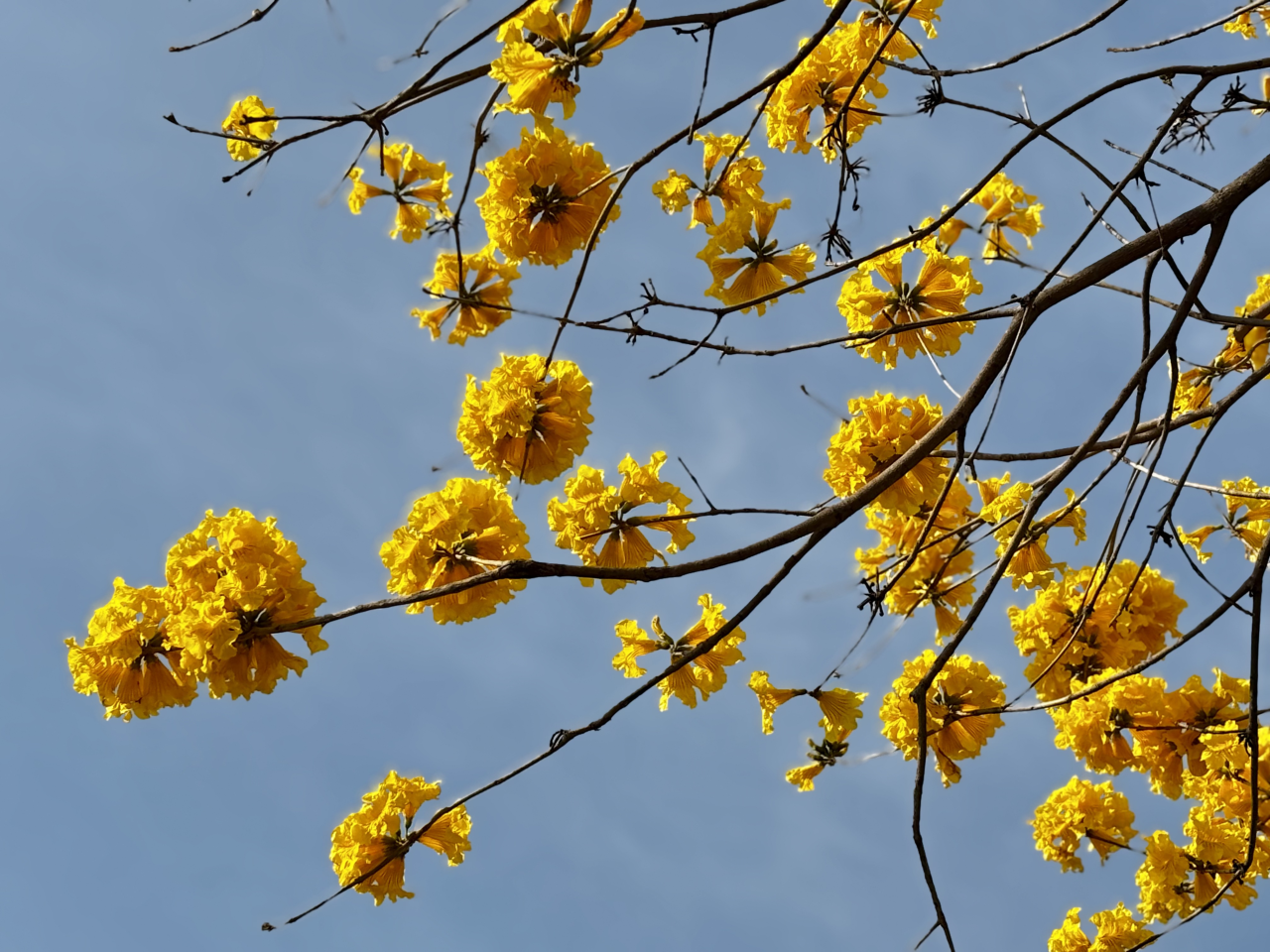 路边的黄花风铃木像是被阳光点燃,满树金黄,远观恰似满树尽戴“黄金甲”,近赏又宛如串串风铃。微风拂过,花枝轻轻摇曳,像是在演奏着一曲春的乐章,奏响了整个春天的绚烂。